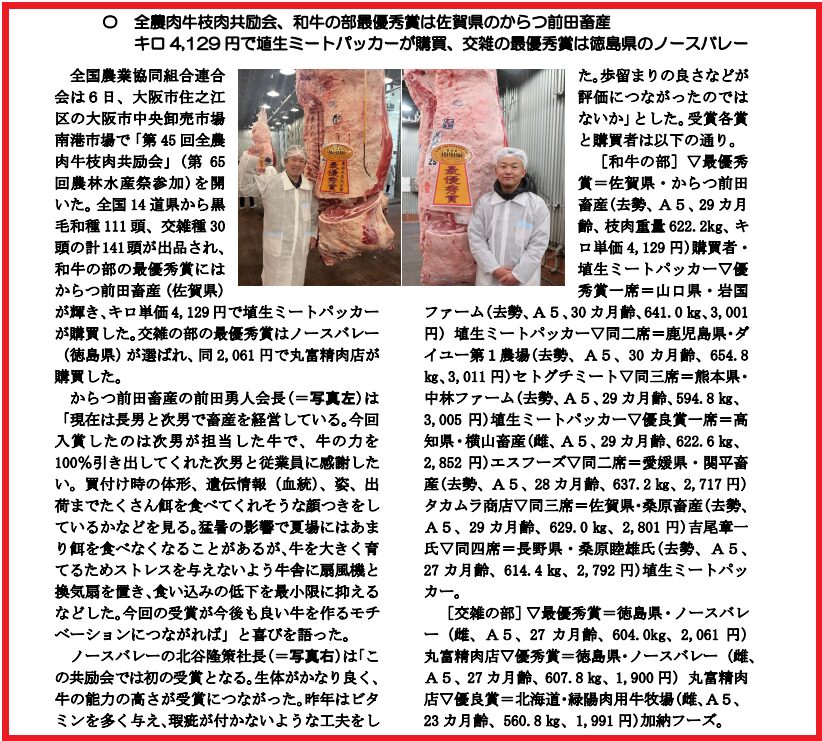 ”第65回農林水産祭参加、第45回全農牛枝肉共励会(開催地:大阪市住之江区 大阪市中央卸売市場南港市場)の黒毛和牛の部・最優秀賞に選ばれた出品牛を弊社が購買” という内容が掲載されております。