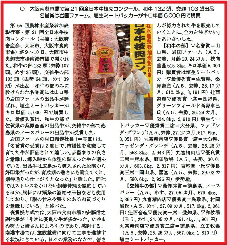 ”第65回農林水産祭参加表彰行事第21回全日本牛枝肉コンクール(主催=大阪府畜産会、大阪市、大阪市食肉市場)の和牛の部の名誉賞に選ばれた出品牛を弊社が購買” という内容が掲載されております。